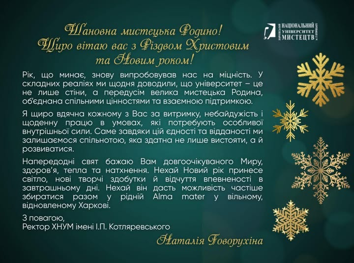 ВІТАННЯ З НОВОРІЧНИМИ СВЯТАМИ РЕКТОРА ХНУМ імені І.П.КОТЛЯРЕВСЬКОГО - ПРОФЕСОРА НАТАЛІЇ ГОВОРУХІНОЇ