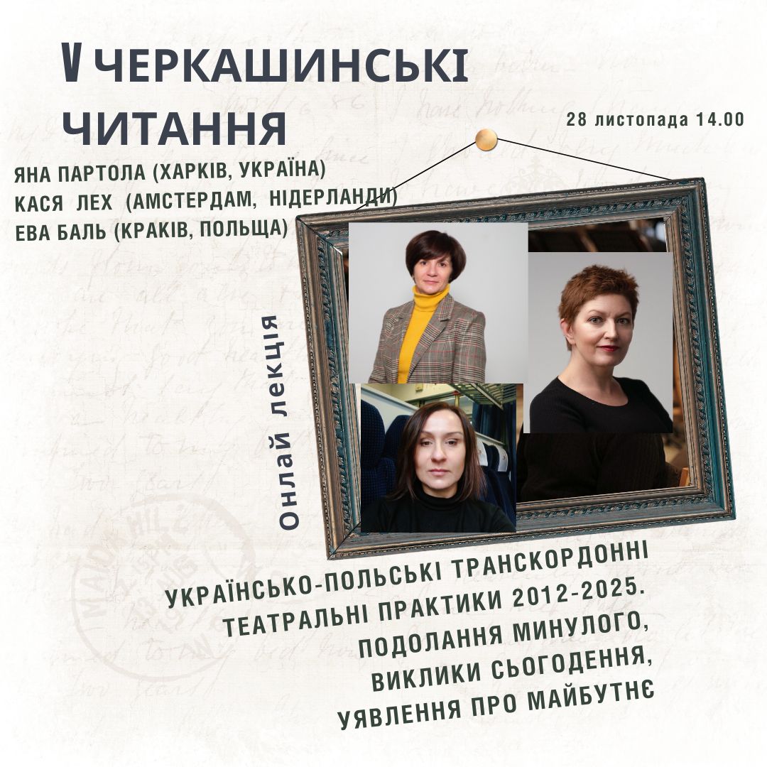 28-29 листопада 2025 р. Харківський національний університет мистецтв імені І.П.Котляревського запрошує взяти участь у V Міжнародних Черкашинських читаннях «Музика і театр в умовах комунікаційного хаосу сьогодення». Захід присвячено пам’яті актора-березільця, фундатора харківської школи художнього читання Романа Черкашина та академіка Академії мистецтв України, доктора мистецтвознавства, професора Марини Черкашиної-Губаренко.