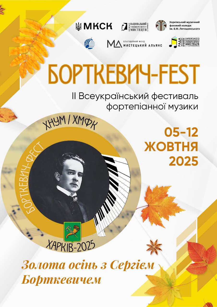 5-12 ЖОВТНЯ 2025 р. У ХНУМ імені І.П.КОТЛЯРЕВСЬКОГО ВІДБУДЕТЬСЯ IІ ВСЕУКРАЇНСЬКИЙ ФЕСТИВАЛЬ ФОРТЕПІАННОЇ МУЗИКИ «БОРТКЕВИЧ-FEST: ЗОЛОТА ОСІНЬ З СЕРГІЄМ БОРТКЕВИЧЕМ». ЗАХІД ПРОЙДЕ У ЗМІШАНОМУ ФОРМАТІ - ОФЛАЙН/ОНЛАЙН.