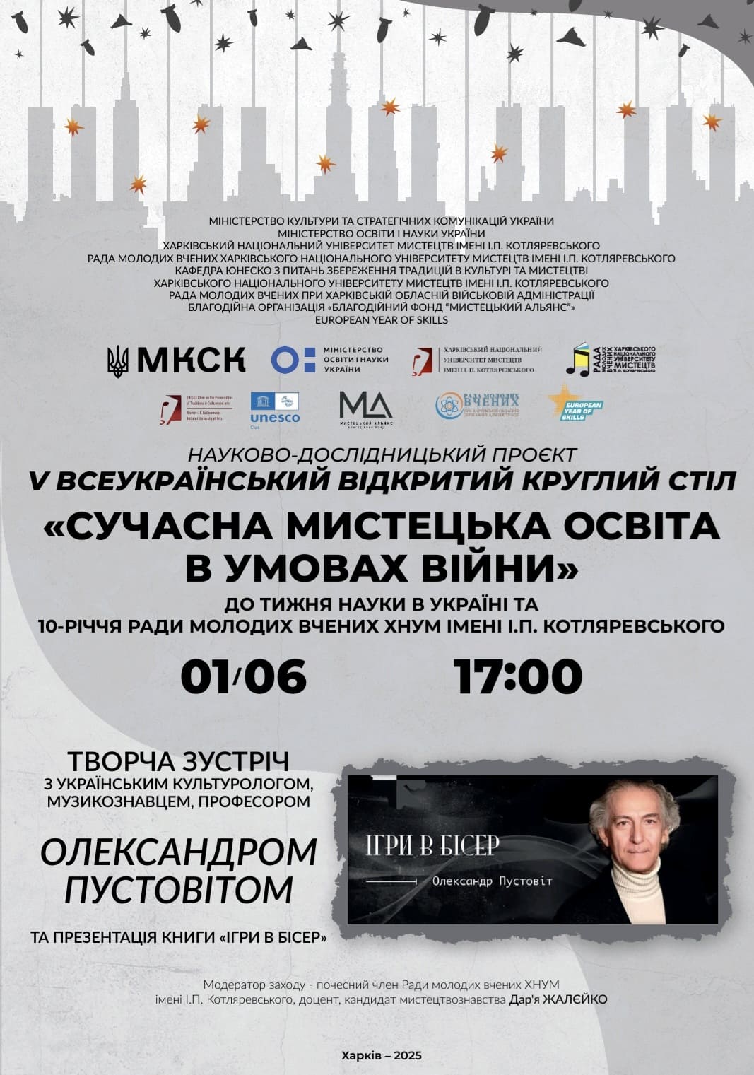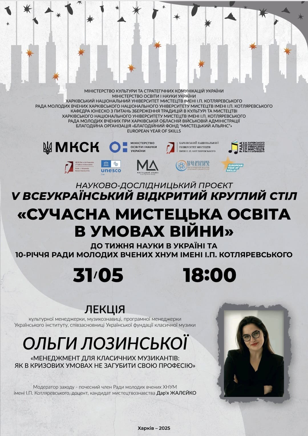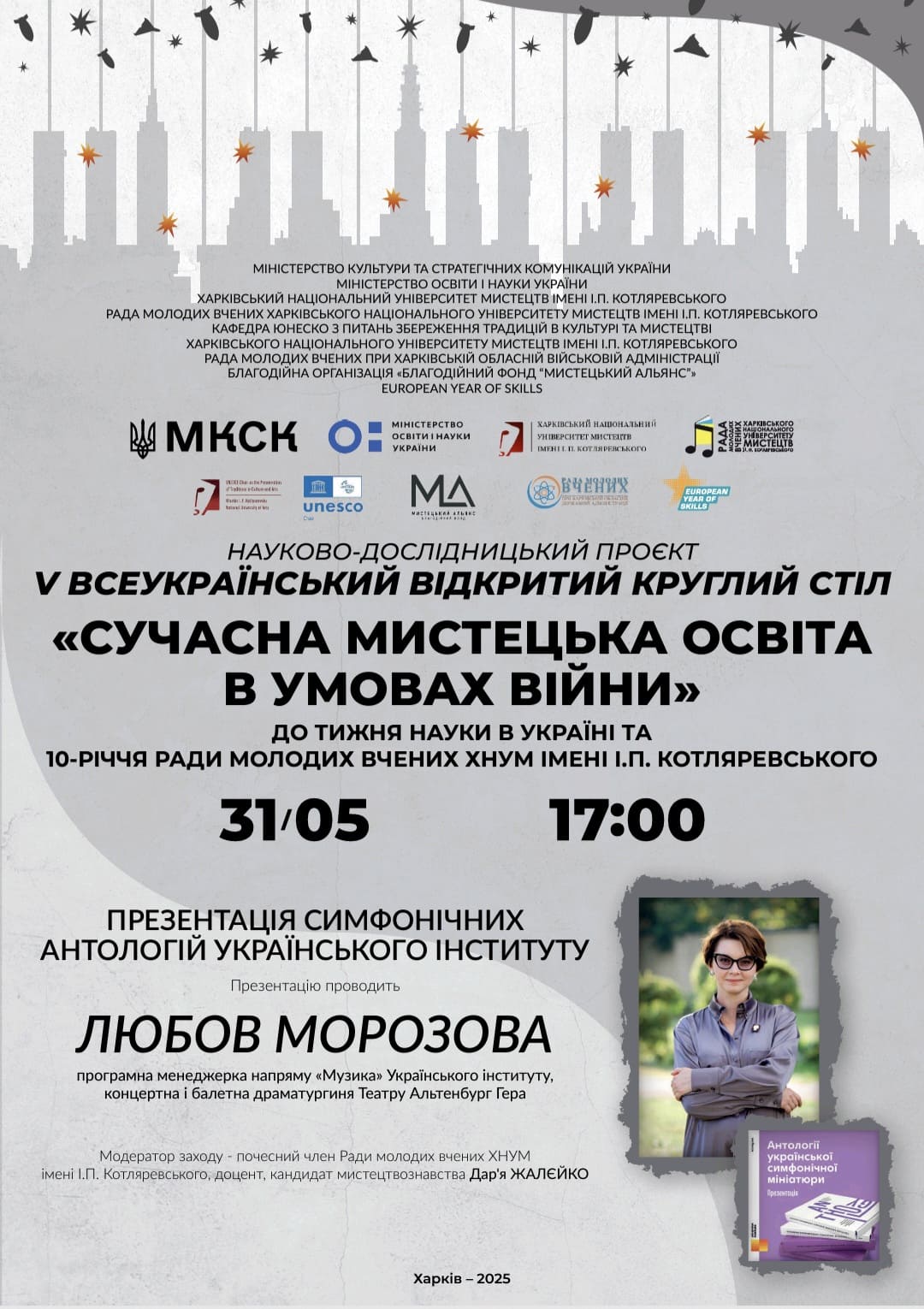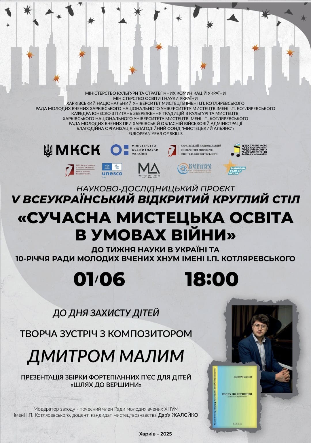До уваги викладачів та концертмейстерів усіх ланок музичної освіти, музичних діячів України! Запрошуємо до участі у V Всеукраїнському Круглому столі «Сучасна мистецька освіта в умовах війни», що відбудеться 31 травня - 1 червня 2025 року у ХНУМ імені І.П.Котляревського, онлайн.