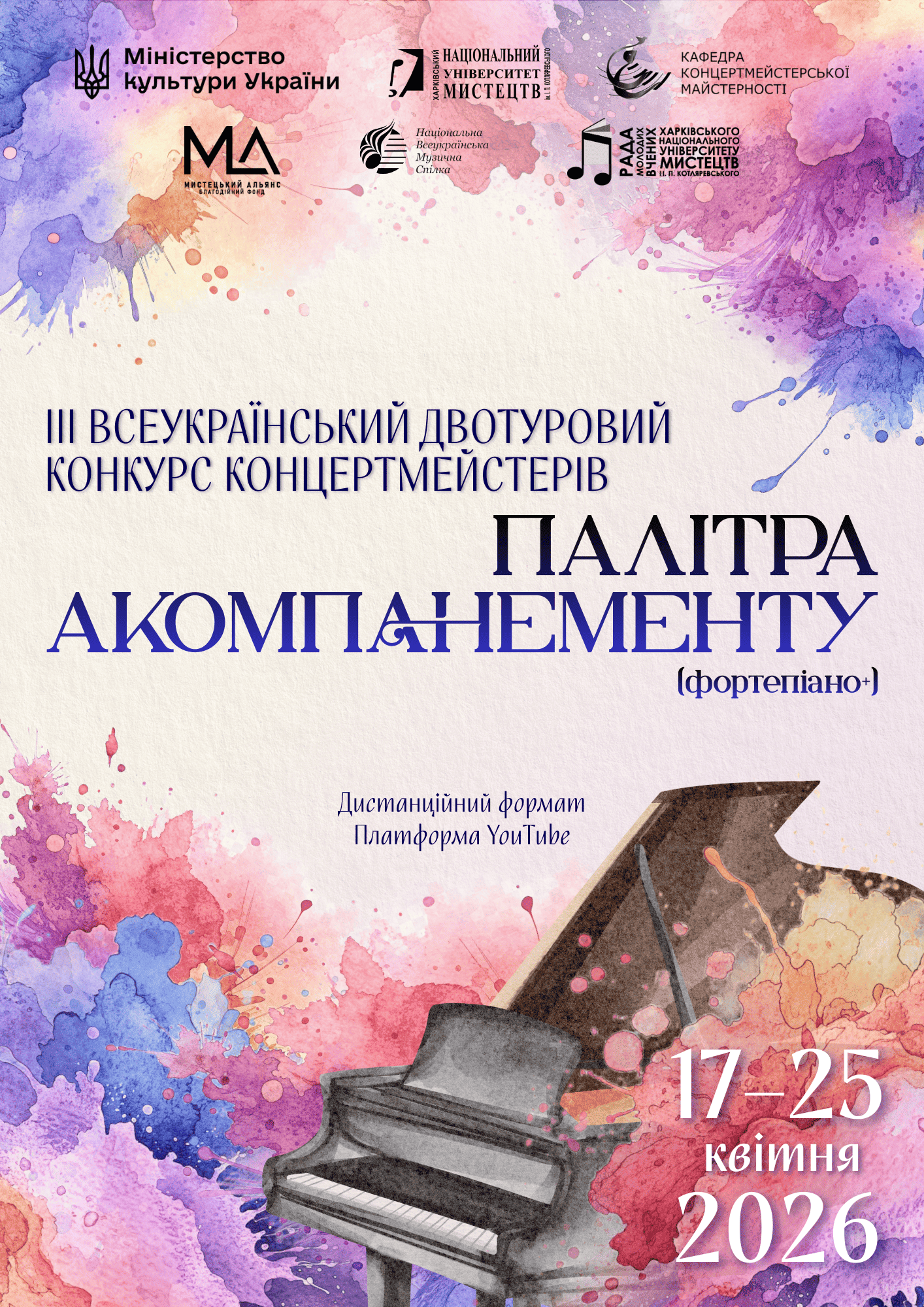 ЗАПРОШУЄМО ДО УЧАСТІ У ТРЕТЬОМУ ВСЕУКРАЇНСЬКОМУ ДВОТУРОВОМУ КОНКУРСІ КОНЦЕРТМЕЙСТЕРІВ «ПАЛІТРА АКОМПАНЕМЕНТУ (ФОРТЕПІАНО+)» ДЛЯ ЗДОБУВАЧІВ-ПІАНІСТІВ МИСТЕЦЬКИХ ШКІЛ, ЛІЦЕЇВ, ЗАКЛАДІВ ФАХОВОЇ ПЕРЕДВИЩОЇ І ВИЩОЇ МИСТЕЦЬКОЇ ОСВІТИ УКРАЇНИ (КОЛЕДЖІВ, АКАДЕМІЙ, УНІВЕРСИТЕТІВ); ПІАНІСТІВ-КОНЦЕРТМЕЙСТЕРІВ ТА ВИКЛАДАЧІВ ФОРТЕПІАНО, ЯКІ ПРАЦЮЮТЬ У ЗАКЛАДАХ МИСТЕЦЬКОЇ ОСВІТИ ВСІХ РІВНІВ (ВСІ ВІКОВІ ГРУПИ). КОНКУРС ВІДБУДЕТЬСЯ 17-25 квітня 2026 р. У ХНУМ імені І.П.КОТЛЯРЕВСЬКОГО, ОНЛАЙН.