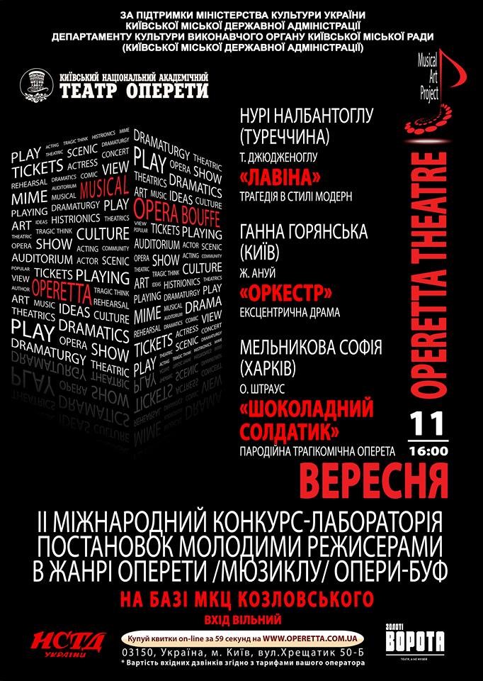 Увазі глядачів були також презентовані інші режисерські роботи: Nuri Nalbantoğlu (Турція) – «Лавина» Т.Джунджерголу, Ганни Горянської (Україна) – «Оркестр» Ж.Ануя.