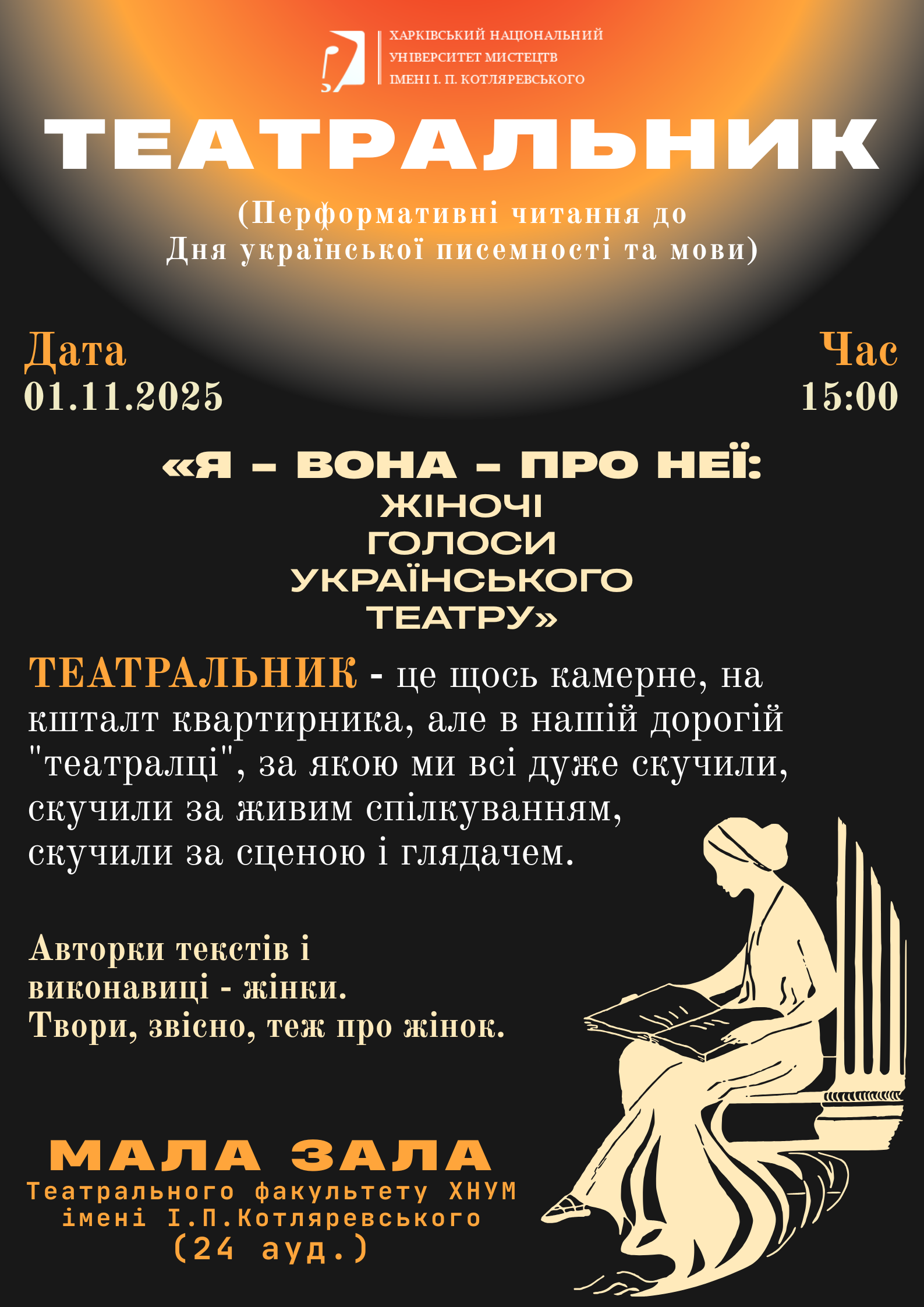 ЗАПРОШУЄМО ДО УЧАСТІ У ВІДКРИТОМУ ОНЛАЙН-КОНКУРСІ «АВТОР МОВИ - КОТЛЯРЕВСЬКИЙ», ЩО ВІДБУДЕТЬСЯ 28 жовтня - 2 листопада 2025 р. У ХНУМ ІМЕНІ І.П.КОТЛЯРЕВСЬКОГО. МОДЕРАТОРИ ЗАХОДУ - КАФЕДРА СЦЕНІЧНОЇ МОВИ.