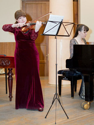 В удивительной гармонии с тембром фортепиано слился воедино великолепный голос альта. Прозвучала первая часть сонаты для альта и фортепиано Н. Паганини в исполнении Ольги Воробьевой и Олега Копелюка.