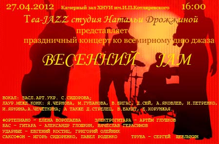 Резюмируя, с удовольствием отмечу, что 27 апреля в камерном зале ХНУМ джаз доказал, что является эффективным инструментом создания радости человеческого общения. Начиная с этого дня 2012 года, Международный день джаза станет фактором единения, диалога и расширения сотрудничества между людьми всей планеты, объединяющим началом с неисчерпаемыми потенциалом и возможностями. А участники Теа-JAZZ студии Натальи Дрожжиной, которые занимаются популяризацией лучших образцов джазовой музыки, безусловно, используют любую возможность, чтобы содействовать более глубокому пониманию не только джазовой музыки, но и ее потенциального вклада в воспитание нравственно здорового и совершенного человека.