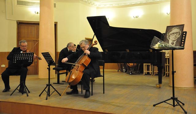 Из вступительного слова к концерту слушатели узнали о личности Г. Б. Аверьянова, его пути от педагога класса виолончели до ректора института искусств. Он обладал ярким темпераментом, был влюблен в музыку и свою влюбленность умел передать другим. На концерте прозвучала соната-элегия «Pro memoria» для виолончели и фортепиано А. Гайденко, эмоционально исполненная В. Кравец. Интересна история создания этого произведения: в основу сонаты была положена мелодия, приснившаяся автору. Сюита «Музицирование в старинном стиле» для скрипки и виолончели М. Карминского (исполненная Ю.Петрушенко и Е.Шадриной) по своему эмоциональному настроению окунула нас в совсем иной мир музыкальной выразительности. В исполнении В. Рудого замечательно прозвучало проникновенное произведение В. Борисова «Романс» для виолончели и фортепиано, наполненный созерцательным настроением.