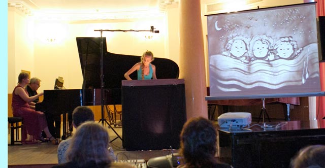 Окончился концерт еще одним сюрпризом. Художник песочной анимации Ольга Лисицкая создала свою композицию во время звучания сюиты «Гулливер» для фортепиано в 4 руки В. Птушкина (исполнители – Народный артист Украины, композитор Владимир Птушкин и одна из инициаторов создания Детской филармонии – Ирина Сухленко). Невозможно передать, как завороженно слушатели следили за появлением «песочных» картин, возникающих под звуки музыки – сцены детства, образы снов, трогательные картинки-воспоминания – настоящее чудо, которое рождалось на наших глазах.