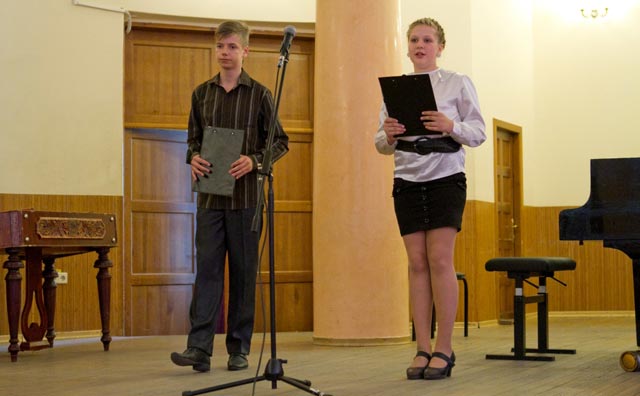 Ведущими концерта стали Юрий Сухленко, учащийся Харьковской сердней специальной музыкальной школы, и Маша Кочолодзян, ученица Харьковской Мариинской гимназии №6. Они не только представляли участников, но и рассказывали забавные истории из детства композиторов. Если вам интересны, например, такие вопросы: во сколько в детстве вставал Ф. Мендельсон? На какие хитрости пускался маленький Э. Григ? Как наказывал отец Н. Паганини за непослушание? – то ответы на них прозвучали из уст ведущих.