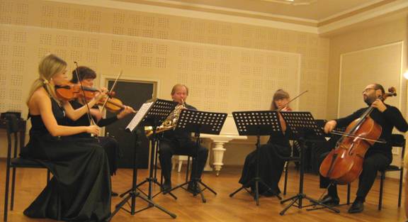 Слева – направо: Ирина Степанова (скрипка), Катерина Захарова (альт), Жан Пьер Берри (валторна),Ольга Воробьева (альт), Виктор Рекало (виолончель)