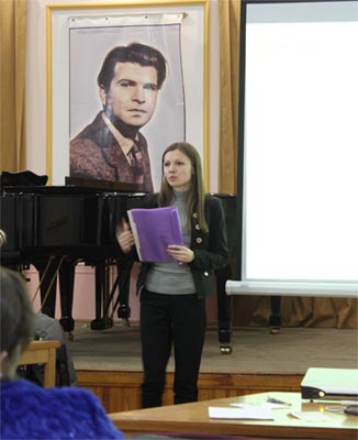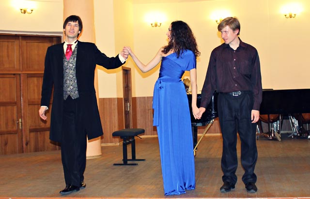 Двое из них – Юлия Набокова и Антон Желновач – учатся на подготовительной отделении и будут поступать в университет, а Андрей Кравцова и Светлана Животова – студенты, имеющие определенные достижения в качестве участников вокальных конкурсов. Они и вышли на сцену, порадовав всех пришедших в гостиную своим мастерством. Самым требовательным слушателем оказалась их педагог, впоследствии признавшаяся, что очень волновалась за ребят. «Порой самой спеть во сто крат легче, чем переживать за них во время выступления», - сказала она с улыбкой. Посетители гостиной пожелали молодежи творческих успехов, выражая надежду, что в скором будущем их имена станут не менее известными, чем имя их талантливого педагога.