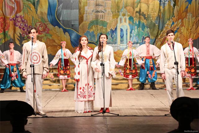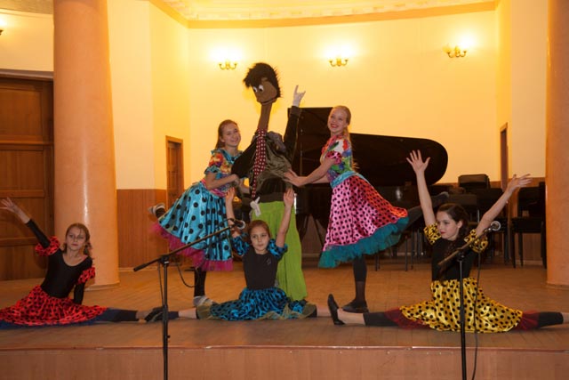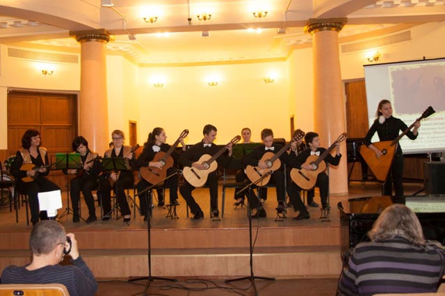 «Співаночки» ярко подтвердили своё название исполнением известной украинской песни «Земле моя, земле» (муз. Е. Кухарцa, сл. М. Негоды) из репертуара народной артистки Украины Раисы Кириченко (1943-2005). Но сегодня вместо густого мощного меццо-сопрано прославленной певицы мы услышали нежные высокие девичьи голоса – и знакомая песня вдруг заиграла неожиданными красками. Оркестр народных инструментов (гитары, домры, бас-балалайка, баян, ударная установка) колоритно исполнил популярное произведение Л. Гранозио «Испанская гитара». В составе оркестра играли не только ученики школы, но также и преподаватели. «Педагогика сотрудничества» уменьшает дистанцию между педагогом и учеником, одаривает ребёнка уверенностью в своих силах и, самое главное, - позволяет играть сложные произведения, давая юному музыканту мощный стимул для дальнейшего роста и несомненное удовольствие от качественного исполнения «здесь и сейчас».
