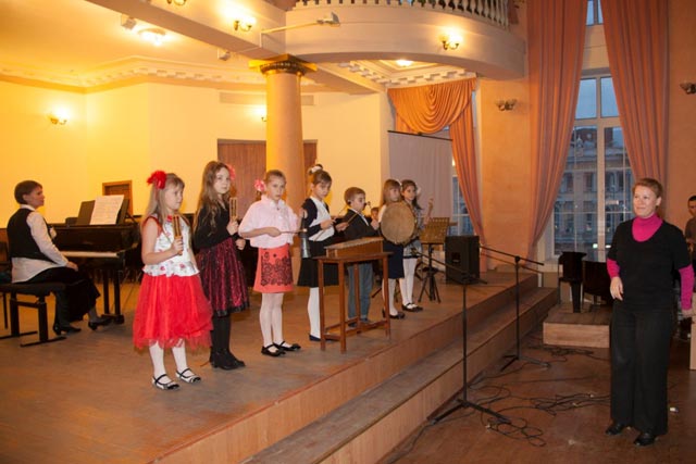 Аналогичным педагогическим задачам отвечает шумовой оркестр, позволяющий самым маленьким ученикам музыкальной школы принимать участие в ансамблевой игре. Шумовой оркестр ДМШ№1 им. Л. Бетховена (руководитель - Евгения Данилова) в прошлом учебном году в своей школе выступил с целым отчётным концертом. Сегодня они представили одно, но очень яркое произведение самого выдающегося композитора Кубы Э.Лекуона (1895-1963) – «Сибоней» (1929). В исполнении шумового оркестра джазовая песенка о любви (слово «сибоней» на Кубе сначала означало «ловец жемчуга», а затем стало нарицательным – «дорогой мой человек») зазвучала по-детски трогательно. Евгения Проценко (фортепиано) подчеркнула мелодическую насыщенность композиции, а маленькие участники оркестра старательно «пронизали» её афро-кубинскими ритмами (автор ритмической композиции – Е. Данилова), используя различные инструменты, в том числе и редкий инструмент африканского происхождения агого, купленный Евгенией Валентиновной специально для этого произведения. Обратил на себя внимание маленький мальчик с большим барабаном – Арсений Чуйко, который ответственно справился со своей непростой задачей. «Ты, наверное ударник»? – спросила я у ребёнка. «Нет, я духовик. Сейчас я играю на блок-флейте, а когда подрасту буду играть на кларнете. Я мечтаю выступить на этой сцене с кларнетом», - поделился маленький музыкант. Мечты, родившиеся в канун Нового года, должны сбыться!