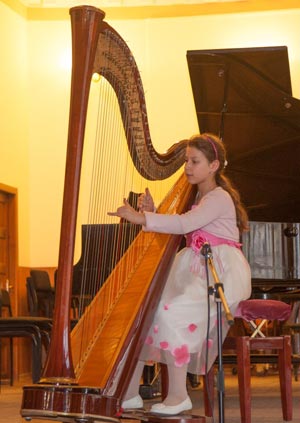 Другая ученица ХССМШи В. Сметана с помощью арфы (негромкие нежные тающие звуки действительно создали ощущение миража) перенесла нас в чудесный райский сад – мавританский сад в Испании (Густавсон, «Мавританский сад»). Арфа – редкий гость на современной сцене, но благодаря учительскому энтузизму Ларисы Клевцовой в ХССМШ-и создан единственный в Украине полный класс арф (9 учеников) и ежегодно проводится Открытый конкурс арфистов.