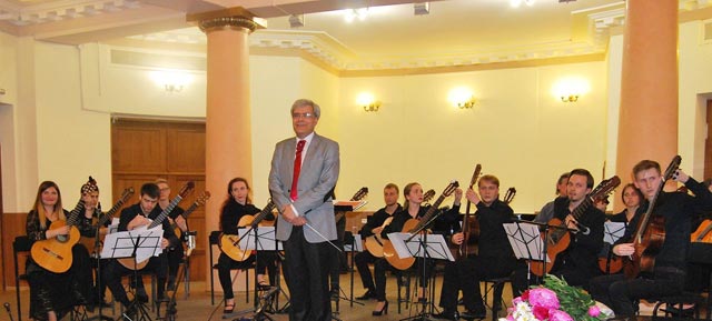 Звіт гітарного класу розпочався з виступу викладачів - професора В. Доценка і доцента В. Ткаченко, які виконали ІІІ частину концерту Р. Дьєнса «Пам’яті П’яццолли» для двох гітар з оркестром. Музика П’яццолли - це трагічно ніжне і солодко-гірке життя пристрасних почуттів, це спогади про хвилини щастя, замкнені у завершеному часі, це оксюморонна трагедія мрій про минуле, яке стає теперішнім тільки у нашій фантазії. Танго не як танок, а як стиль життя. Це і є образ П’яццолли у концерті Дієнса: музика любові, пристрасті і суму - музика про кохання, що завершилось, музика про людину, що відійшла у вічність, але залишила нам свою душу. Немає вже з нами і самого Дієнса. Він помер у жовтні 2016 р., відмітивши своє 61-річчя.
