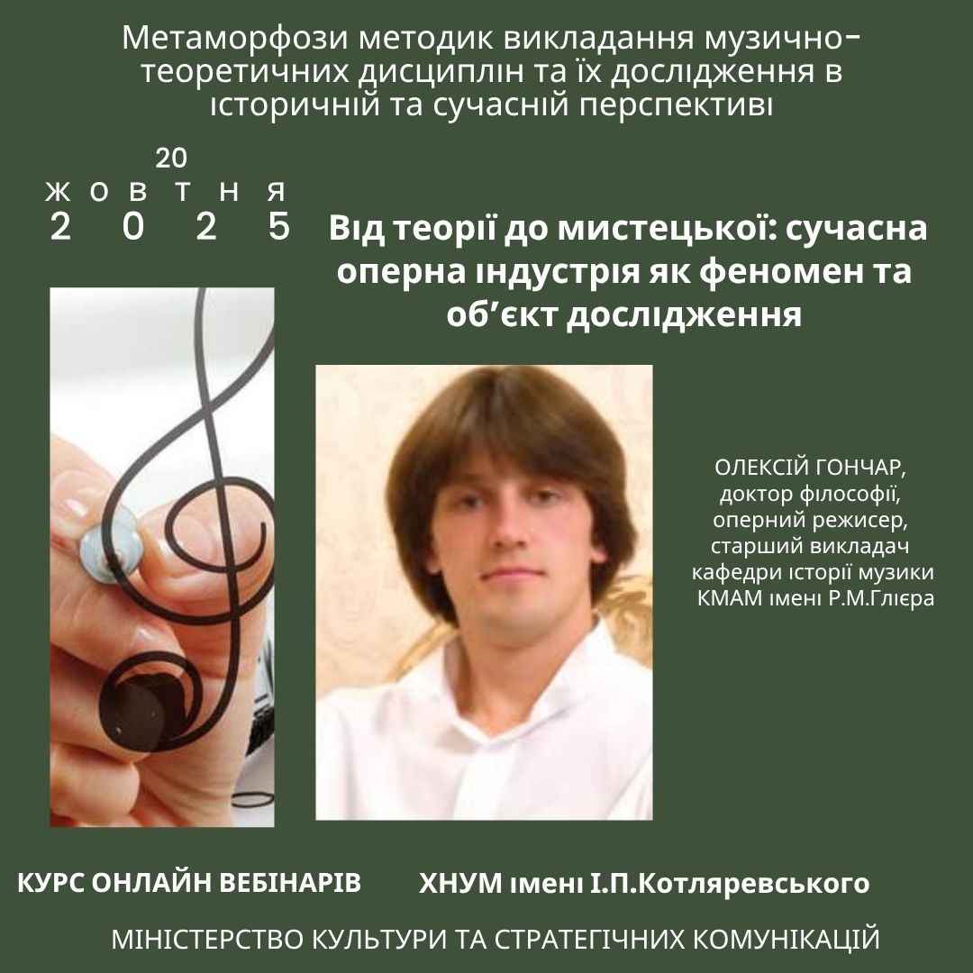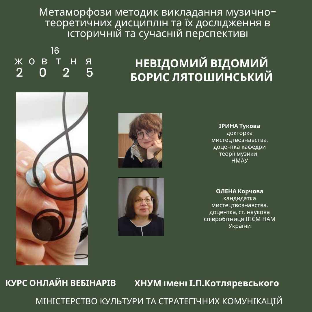 Протягом жовтня у ХНУМ імені І.П.Котляревського відбулася серія онлайн-вебінарів, а також Круглий стіл «Метаморфози методик викладання музично-теоретичних дисциплін та їх дослідження в історичній та сучасній перспективі». Модератор заходу - університетська кафедра історії української та зарубіжної музики. Тижневі онлайн вебінари, а саме, 5 вебінарів і Круглий стіл, відбулися дистанційно 16, 17, 19, 21, 23 та 25 жовтня 2025 р.
