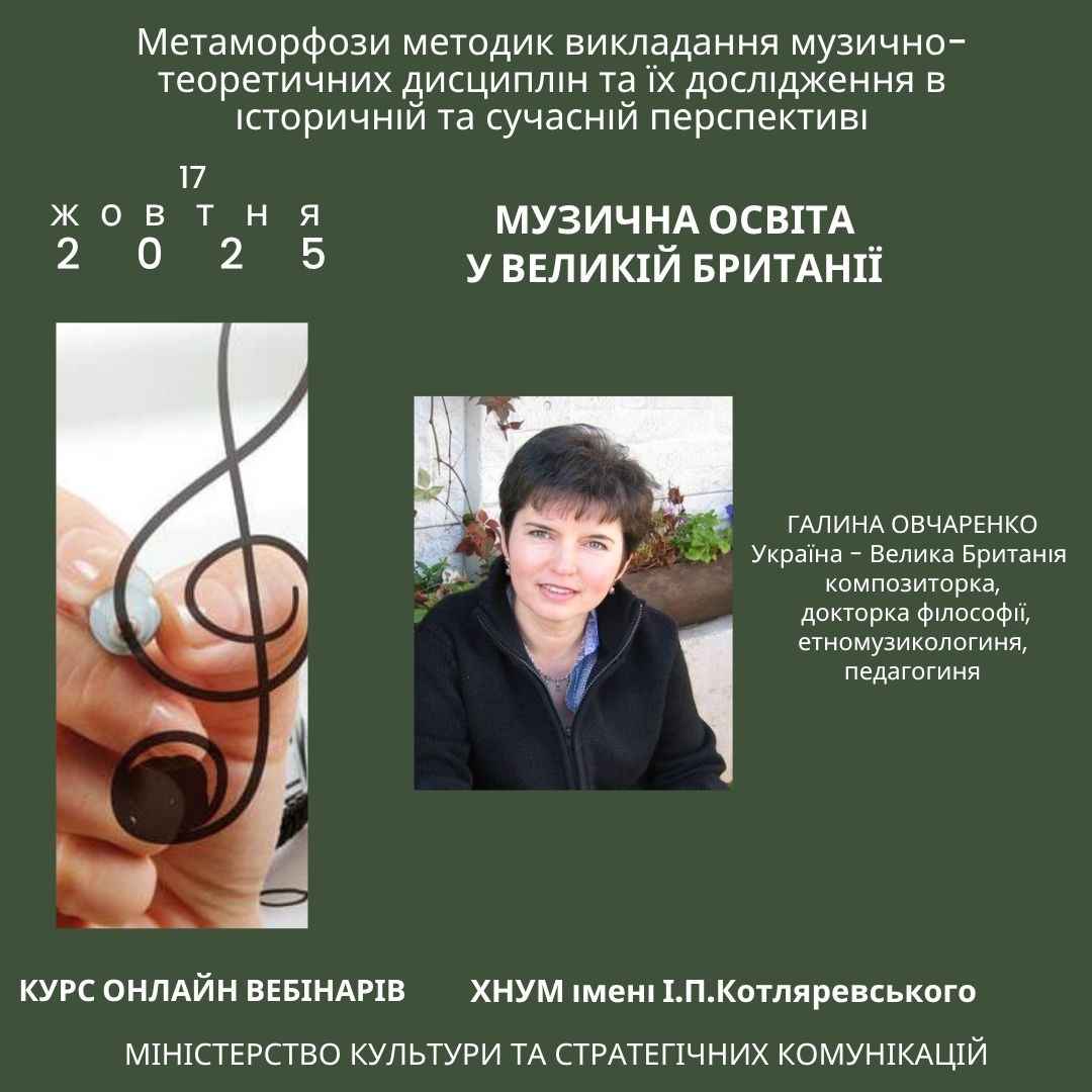 17 жовтня – Галина Овчаренко (Україна – Велика Британія), композиторка, докторка філософії, етномузикологиня, педагогиня, яка виступила із темою «Музична освіта у Великій Британії». Маючи великий досвід викладання музичних дисциплін (гра на фортепіано, композиція, теорія музики) для дітей в освітніх закладах Бристоля, Галина Овчаренко на вебінарі прокоментувала атестаційні вимоги до учнів на екзаменах з теорії музики (Grade 5 and Grade 8) і доповіла про відмінності методики викладання теоретичних дисциплін у музичних школах Великої Британії.