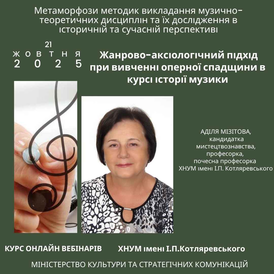 21 жовтня – Аділя Мізітова (Харків, Україна), кандидатка мистецтвознавства, професорка, почесна професорка ХНУМ імені І.П.Котляревського, виступила із темою «Жанрово-аксіологічний підхід при вивченні оперної спадщини в курсі історії музики». Рідкісні відео-записи оперних вистав «Манон Леско» Даніеля Обера та «Бульвар Самотності» Ханса Вернера Хенце викликали надзвичайну зацікавленість і захоплення аудиторії. Аділя Мізітова є авторкою навчального посібника «Оповідь про Манон Леско в історичному просторі оперного жанру», який розміщено у репозитарії ХНУМ.