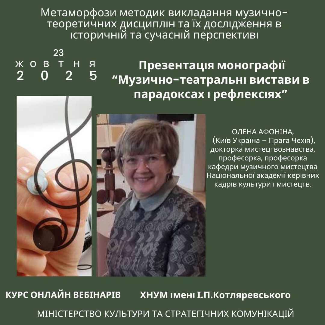 23 жовтня – Олена Афоніна (Київ, Україна - Чехія), докторка мистецтвознавства, професорка, професорка кафедри музичного мистецтва Національної академії керівних кадрів культури і мистецтв, презентувала свою нову монографію «Музично-театральні вистави в парадоксах і рефлексіях». На вебінарі спікерка представила панораму балетних вистав постмодернізму: «Аладдін» О.Родіна та С.Кона, «Дама з камеліями» Дж.Ноймайєра, А.Рехвіашвілі та О.Баклана, «Зимова подорож» К.Спука з музикою вокального циклу Ф.Шуберта, «Вій» О.Родіна та Р.Поклітару. У книзі також порушуються питання музично-театрального коду творів М.Гоголя, зокрема, у мюзиклі У.Бекірова за повістю «Шинель», або як складний світ Данте розкривається у жанрі балету. Окремі епізоди книги присвячені чеському музично-театральному контенту, оскільки авторка має можливість наживо бачити всі новітні постановки, наприклад, двадцять першу версію опери Б.Сметани «Продана наречена» режисерки Е.Нелліс у Narodni divadlо у Празі та «Трамвай бажання» Дж.Ноймайєра.