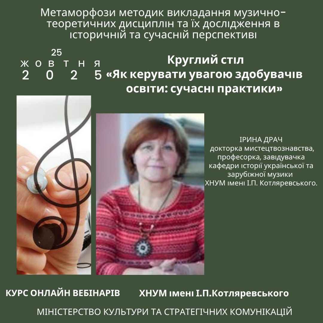 25 жовтня завершилися онлайн-вебінари підсумковим Круглим столом «Як керувати увагою здобувачів освіти: сучасні практики», який провела Ірина Драч, завідувачка кафедри історії української та зарубіжної музики ХНУМ імені І.П. Котляревського, докторка мистецтвознавства, професорка.