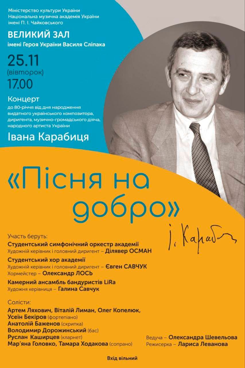 25 листопада у Великій Залі імені В. Сліпака НМАУ імені П. І. Чайковського відбувся концерт з нагоди 80-річчя від Дня народження народного артиста України, композитора Івана КАРАБИЦЯ.