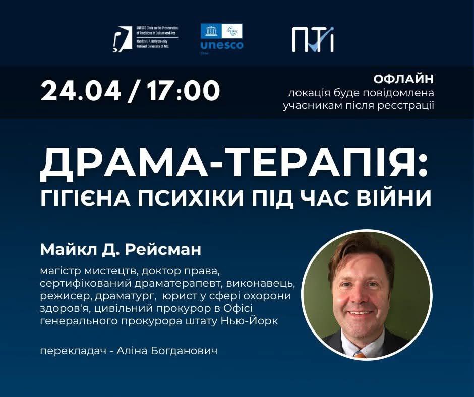 24 квітня. Майстер-клас «Драма-терапія: гігієна психіки під час війни» за участю Майкла Рейсмана (США)