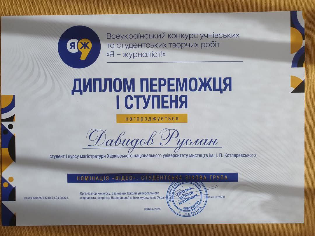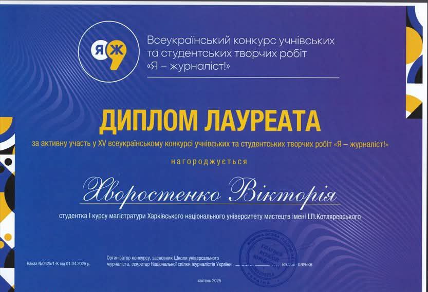 10 квітня у Харкові відбулося урочисте нагородження лауреатів XV Всеукраїнського конкурсу учнівських і студентських творчих робіт «Я – журналіст», що відбувся за сприянням Національної спілки журналістів України, інформаційної підтримки Міністерства освіти і науки України, Міністерства культури та стратегічних комунікацій України та інших інституцій, в якому взяли участь понад тисяча учасників з навчальних закладів всіх областей України та міста Київа.