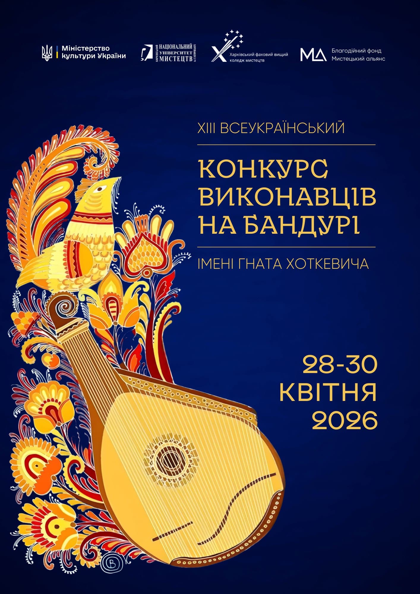 ЗАПРОШУЄМО ДО УЧАСТІ У XIII ВСЕУКРАЇНСЬКОМУ КОНКУРСІ ВИКОНАВЦІВ НА БАНДУРІ ІМЕНІ ГНАТА ХОТКЕВИЧА, ЩО ВІДБУДЕТЬСЯ 28-30 КВІТНЯ 2026 р. У ХНУМ ІМЕНІ І.П. КОТЛЯРЕВСЬКОГО, ОНЛАЙН.